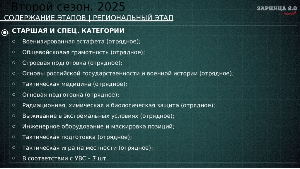 Второй сезон. 2025 СОДЕРЖАНИЕ ЭТАПОВ | РЕГИОНАЛЬНЫЙ ЭТАП СТАРШАЯ И СПЕЦ. КАТЕГОРИИ Военизированная эстафета (отрядное); Общевойсковая грамотность (отрядное); Строевая подготовка (отрядное); Основы российской государственности и военной истории (отрядное); Тактическая медицина (отрядное); Огневая подготовка (отрядное); Радиационная, химическая и биологическая защита (отрядное); Выживание в экстремальных условиях (отрядное); Инженерное оборудование и маскировка позиций; Тактическая подготовка (отрядное); Тактическая игра на местности (отрядное); В соответствии с УВС – 7 шт.