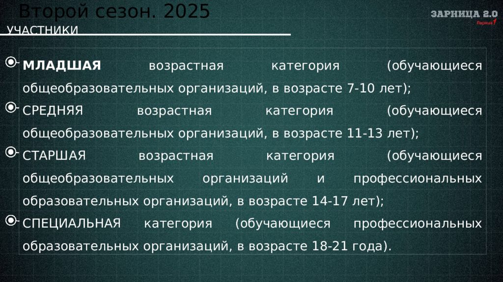 Второй сезон. 2025 УЧАСТНИКИ МЛАДШАЯ возрастная категория (обучающиеся общеобразовательных организаций, в возрасте 7-10 лет); СРЕДНЯЯ возрастная категория (обучающиеся общеобразовательных организаций, в возрасте 11-13 лет); СТАРШАЯ возрастная категория (обучающиеся общеобразовательных организаций и профессиональных образовательных организаций, в возрасте 14-17 лет); СПЕЦИАЛЬНАЯ категория (обучающиеся профессиональных образовательных организаций, в возрасте 18-21 года).