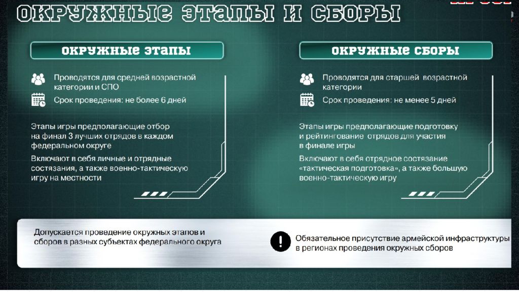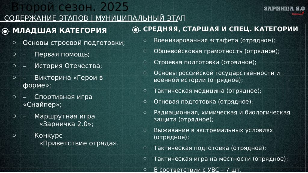 Второй сезон. 2025 СОДЕРЖАНИЕ ЭТАПОВ | МУНИЦИПАЛЬНЫЙ ЭТАП МЛАДШАЯ КАТЕГОРИЯ Основы строевой подготовки; Первая помощь; История Отечества; Викторина «Герои в форме»; Спортивная игра «Снайпер»; Маршрутная игра « Зарничка 2.0»; Конкурс «Приветствие отряда». СРЕДНЯЯ, СТАРШАЯ И СПЕЦ. КАТЕГОРИИ Военизированная эстафета (отрядное); Общевойсковая грамотность (отрядное); Строевая подготовка (отрядное); Основы российской государственности и военной истории (отрядное); Тактическая медицина (отрядное); Огневая подготовка (отрядное); Радиационная, химическая и биологическая защита (отрядное); Выживание в экстремальных условиях (отрядное); Тактическая подготовка (отрядное); Тактическая игра на местности (отрядное); В соответствии с УВС – 7 шт.