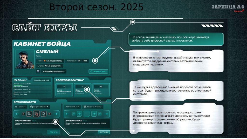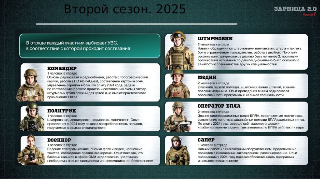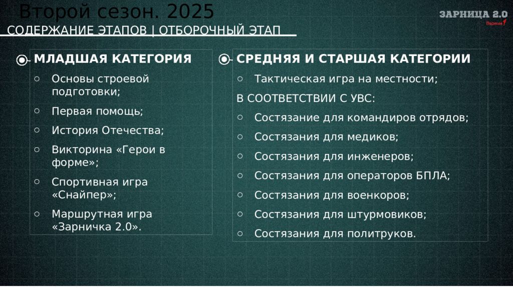 Второй сезон. 2025 СОДЕРЖАНИЕ ЭТАПОВ | ОТБОРОЧНЫЙ ЭТАП МЛАДШАЯ КАТЕГОРИЯ Основы строевой подготовки; Первая помощь; История Отечества; Викторина «Герои в форме»; Спортивная игра «Снайпер»; Маршрутная игра « Зарничка 2.0». СРЕДНЯЯ И СТАРШАЯ КАТЕГОРИИ Тактическая игра на местности; В СООТВЕТСТВИИ С УВС: Состязание для командиров отрядов; Состязания для медиков; Состязания для инженеров; Состязания для операторов БПЛА; Состязания для военкоров; Состязания для штурмовиков; Состязания для политруков.