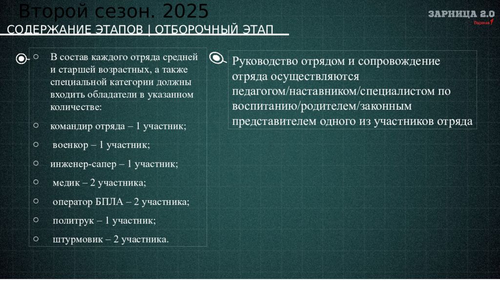 Второй сезон. 2025 СОДЕРЖАНИЕ ЭТАПОВ | ОТБОРОЧНЫЙ ЭТАП В состав каждого отряда средней и старшей возрастных, а также специальной категории должны входить обладатели в указанном количестве: командир отряда – 1 участник; военкор – 1 участник; инженер-сапер – 1 участник; медик – 2 участника; оператор БПЛА – 2 участника; политрук – 1 участник; штурмовик – 2 участника. Руководство отрядом и сопровождение отряда осуществляются педагогом/наставником/специалистом по воспитанию/родителем/законным представителем одного из участников отряда