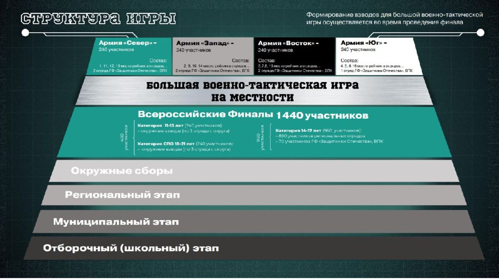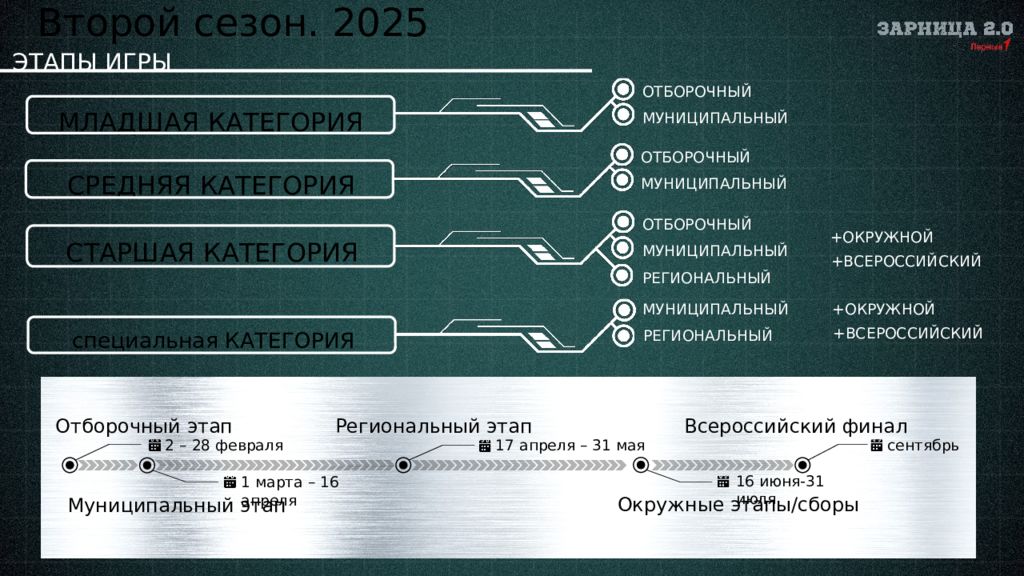 МЛАДШАЯ КАТЕГОРИЯ ОТБОРОЧНЫЙ МУНИЦИПАЛЬНЫЙ СРЕДНЯЯ КАТЕГОРИЯ ОТБОРОЧНЫЙ МУНИЦИПАЛЬНЫЙ СТАРШАЯ КАТЕГОРИЯ ОТБОРОЧНЫЙ МУНИЦИПАЛЬНЫЙ РЕГИОНАЛЬНЫЙ +ОКРУЖНОЙ +ВСЕРОССИЙСКИЙ специальная КАТЕГОРИЯ МУНИЦИПАЛЬНЫЙ РЕГИОНАЛЬНЫЙ +ОКРУЖНОЙ +ВСЕРОССИЙСКИЙ Отборочный этап 2 – 28 февраля Муниципальный этап 1 марта – 16 апреля Региональный этап 17 апреля – 31 мая Окружные этапы/сборы 16 июня-31 июля Всероссийский финал сентябрь Второй сезон. 2025 ЭТАПЫ ИГРЫ