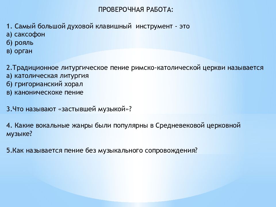 ПРОВЕРОЧНАЯ РАБОТА: 1. Самый большой духовой клавишный инструмент - это а) саксофон б) рояль в) орган 2.Традиционное литургическое пение римско-католической церкви называется а) католическая литургия б) григорианский хорал в) каноническоке пение 3. Что называют «застывшей музыкой»? 4. Какие вокальные жанры были популярны в Средневековой церковной музыке? 5. Как называется пение без музыкального сопровождения?
