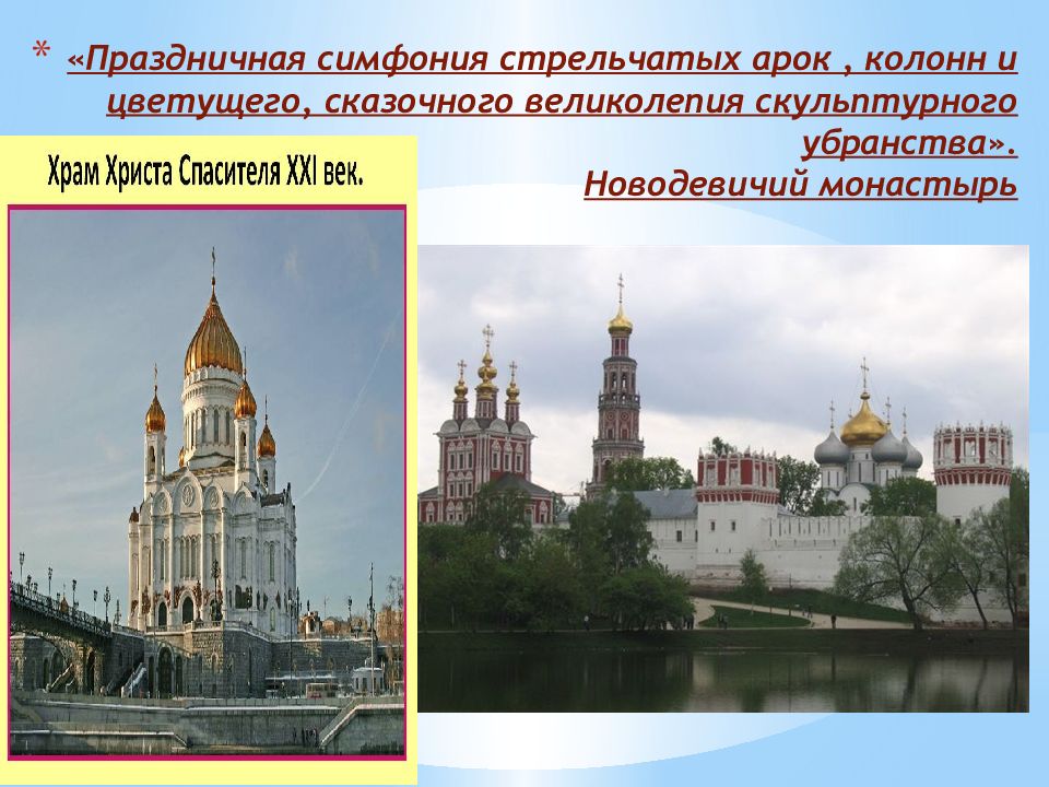 Слайд 14: Праздничная симфония стрельчатых арок, колонн и цветущего, сказочного великолепия скульптурного убранства». Новодевичий монастырь