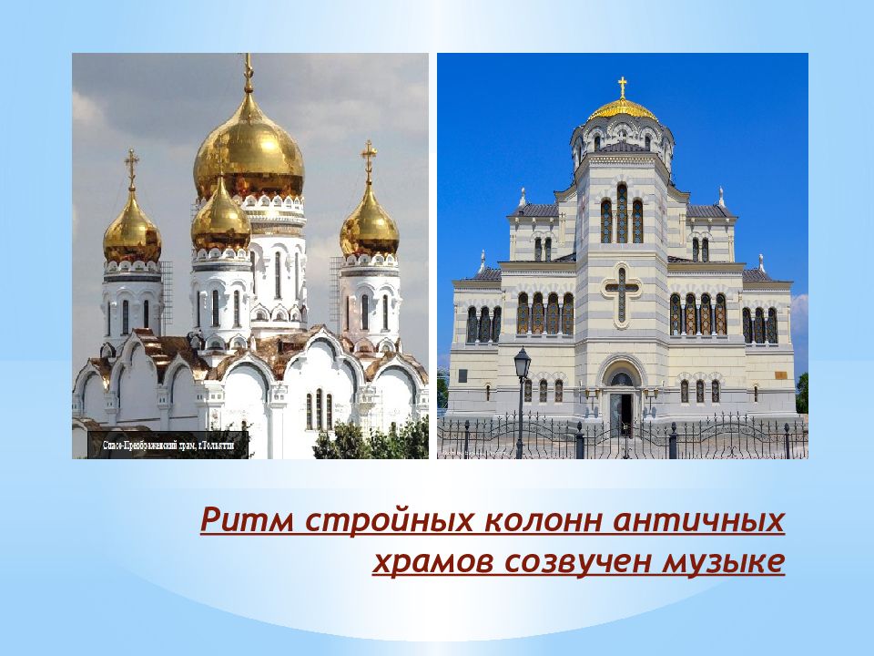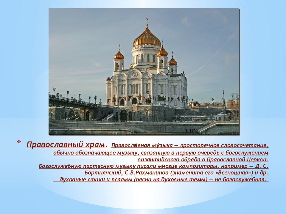 Слайд 10: Православный храм. Правосла́вная му́зыка — просторечное словосочетание, обычно обозначающее музыку, связанную в первую очередь с богослужением византийского обряда в Православной Церкви. Богослужебную партесную музыку писали многие композиторы, например — Д. С. Бортнянский, С.В.Рахманинов (знаменита его «Всенощная») и др. духовные стихи и псалмы (песни на духовные темы) — не богослужебная