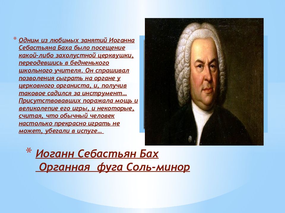 Одним из любимых занятий Иоганна Себастьяна Баха было посещение какой-либо захолустной церквушки, переодевшись в бедненького школьного учителя. Он спрашивал позволения сыграть на органе у церковного органиста, и, получив таковое садился за инструмент… Присутствовавших поражала мощь и великолепие его игры, и некоторые, считая, что обычный человек настолько прекрасно играть не может, убегали в испуге… Иоганн Себастьян Бах Органная фуга Соль-минор