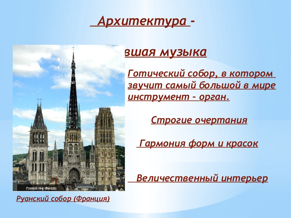 Руанский собор (Франция) Готический собор, в котором звучит самый большой в мире инструмент – орган. Строгие очертания Гармония форм и красок Величественный интерьер