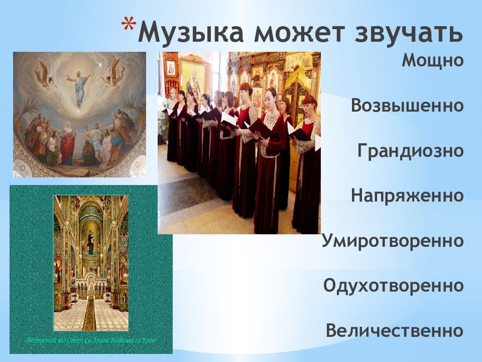 Слайд 15: Музыка может звучать Мощно Возвышенно Грандиозно Напряженно Умиротворенно Одухотворенно Величественно