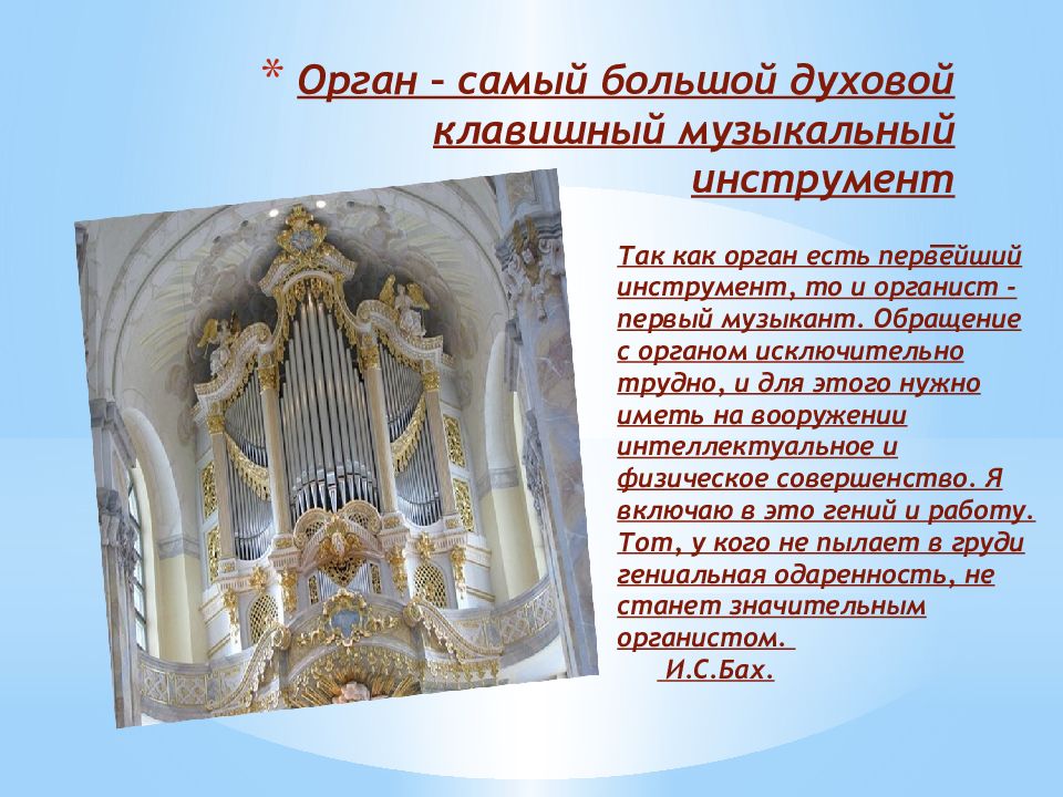 Слайд 8: Орган – самый большой духовой клавишный музыкальный инструмент