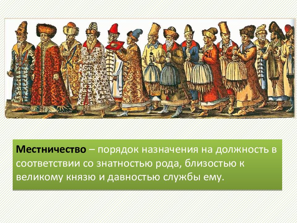 Местничество – порядок назначения на должность в соответствии со знатностью рода, близостью к великому князю и давностью службы ему.