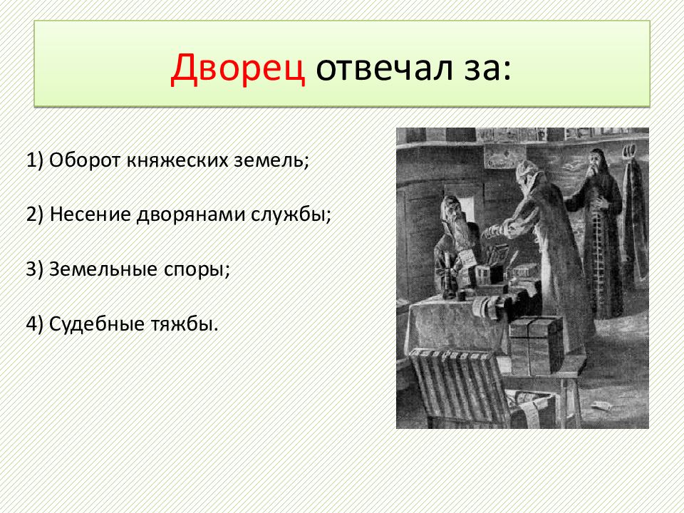 1) Оборот княжеских земель; 2) Несение дворянами службы; 3) Земельные споры; 4) Судебные тяжбы. Дворец отвечал за :