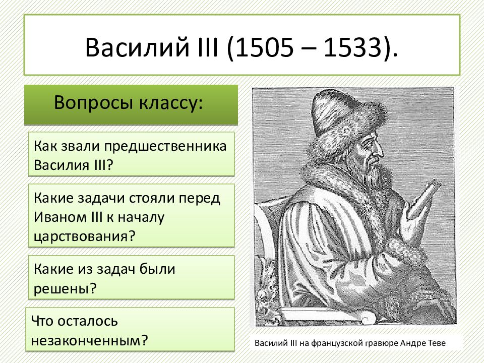 Вопросы классу: Как звали предшественника Василия III ? Какие задачи стояли перед Иваном III к началу царствования? Какие из задач были решены? Что осталось незаконченным? Василий III на французской гравюре Андре Теве