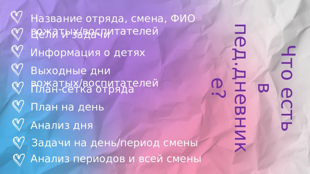 Что есть в пед.дневнике ? Название отряда, смена, ФИО вожатых/воспитателей Цели и задачи Информация о детях Выходные дни вожатых/воспитателей План-сетка отряда План на день Анализ дня Задачи на день/период смены Анализ периодов и всей смены