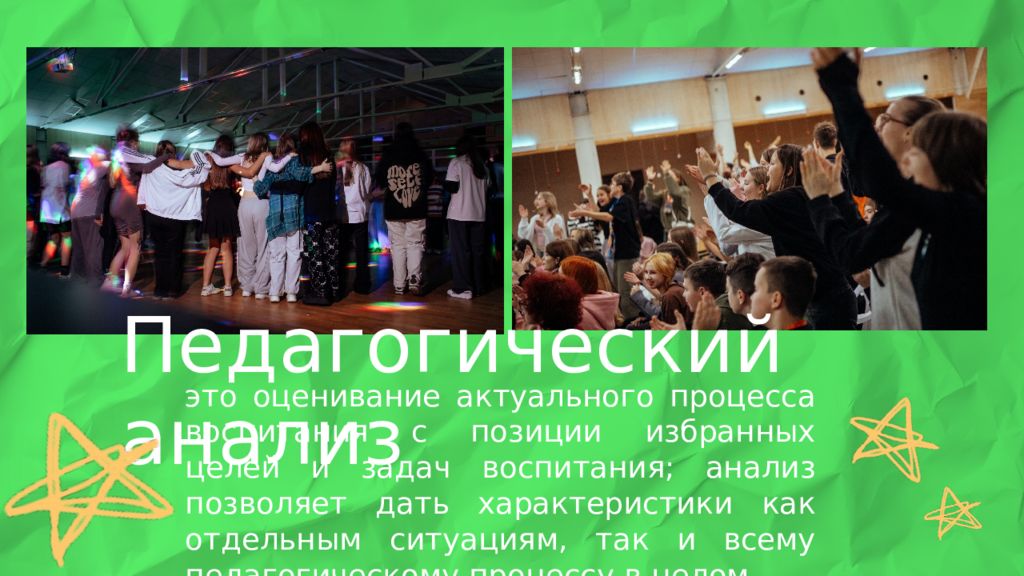 Педагогический анализ это оценивание актуального процесса воспитания с позиции избранных целей и задач воспитания; анализ позволяет дать характеристики как отдельным ситуациям, так и всему педагогическому процессу в целом.