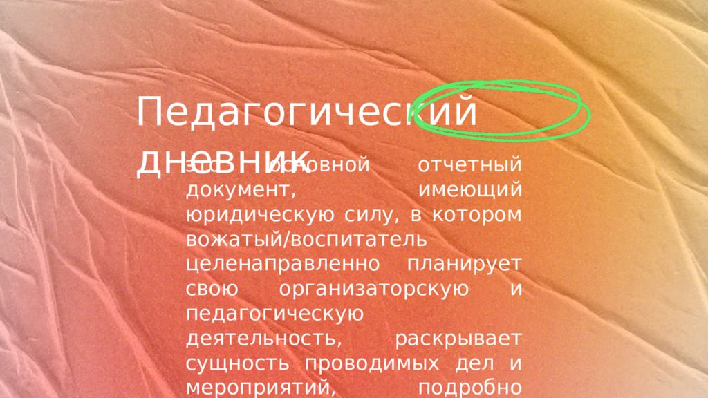 Педагогический дневник это основной отчетный документ, имеющий юридическую силу, в котором вожатый/воспитатель целенаправленно планирует свою организаторскую и педагогическую деятельность, раскрывает сущность проводимых дел и мероприятий, подробно анализирует каждый прожитый день с отрядом, делает выводы, обобщения, намечает перспективы.