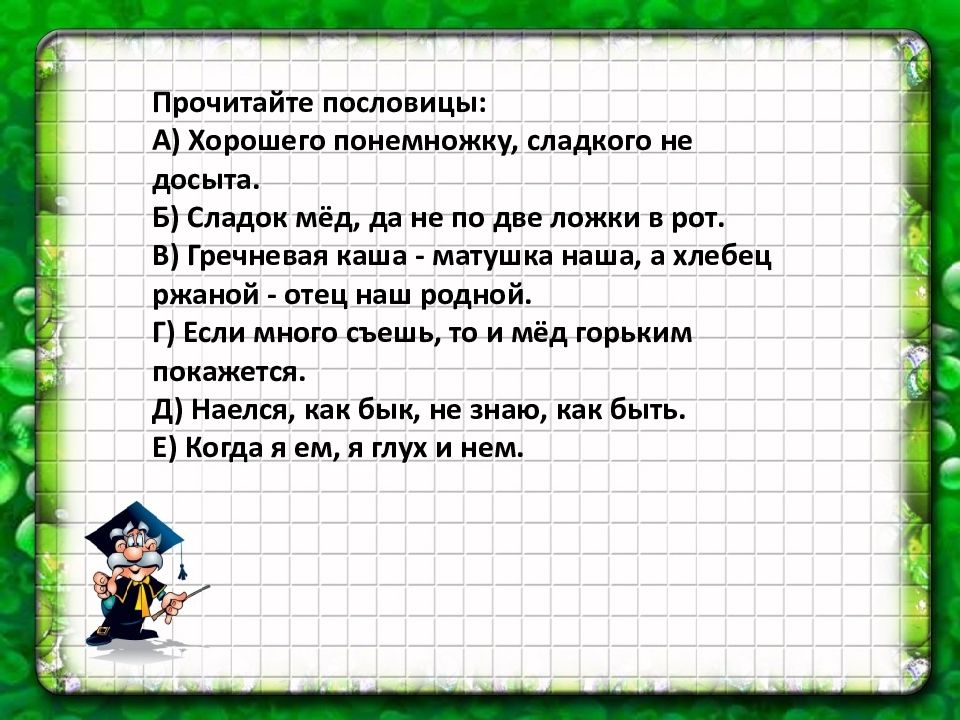 Прочитайте пословицы: А) Хорошего понемножку, сладкого не досыта. Б) Сладок мёд, да не по две ложки в рот. В) Гречневая каша - матушка наша, а хлебец ржаной - отец наш родной. Г) Если много съешь, то и мёд горьким покажется. Д) Наелся, как бык, не знаю, как быть. Е) Когда я ем, я глух и нем.