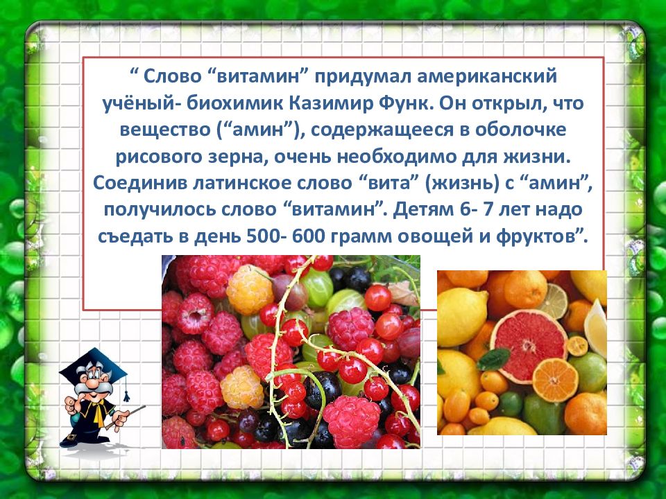 “ Слово “витамин” придумал американский учёный- биохимик Казимир Функ. Он открыл, что вещество (“амин”), содержащееся в оболочке рисового зерна, очень необходимо для жизни. Соединив латинское слово “вита” (жизнь) с “амин”, получилось слово “витамин”. Детям 6- 7 лет надо съедать в день 500- 600 грамм овощей и фруктов”.