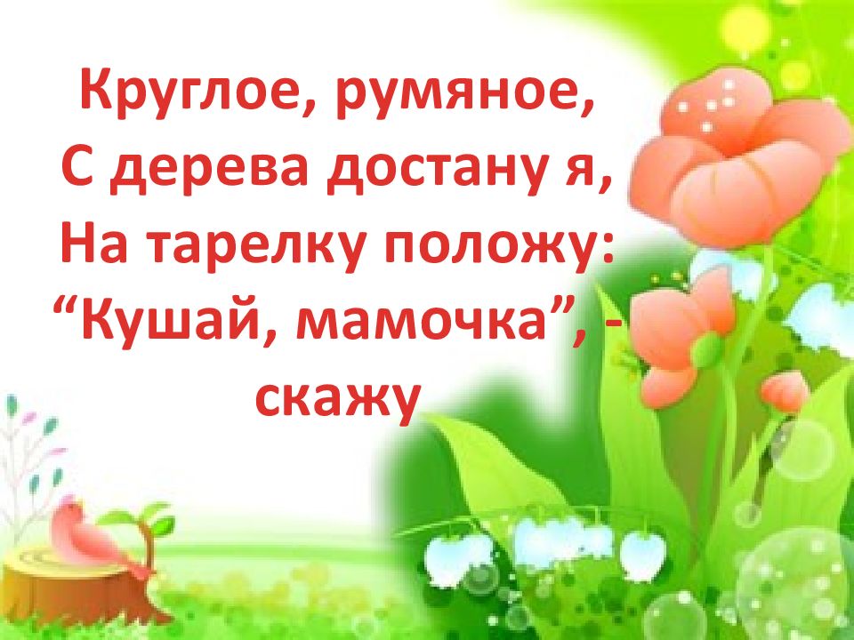 Круглое, румяное, С дерева достану я, На тарелку положу: “Кушай, мамочка”, - скажу