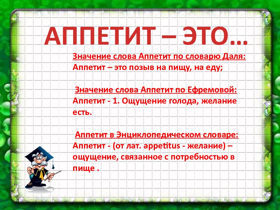АППЕТИТ – ЭТО… Значение слова Аппетит по словарю Даля: Аппетит – это позыв на пищу, на еду; Значение слова Аппетит по Ефремовой: Аппетит - 1. Ощущение голода, желание есть. Аппетит в Энциклопедическом словаре: Аппетит - (от лат. appetitus - желание) – ощущение, связанное с потребностью в пище.