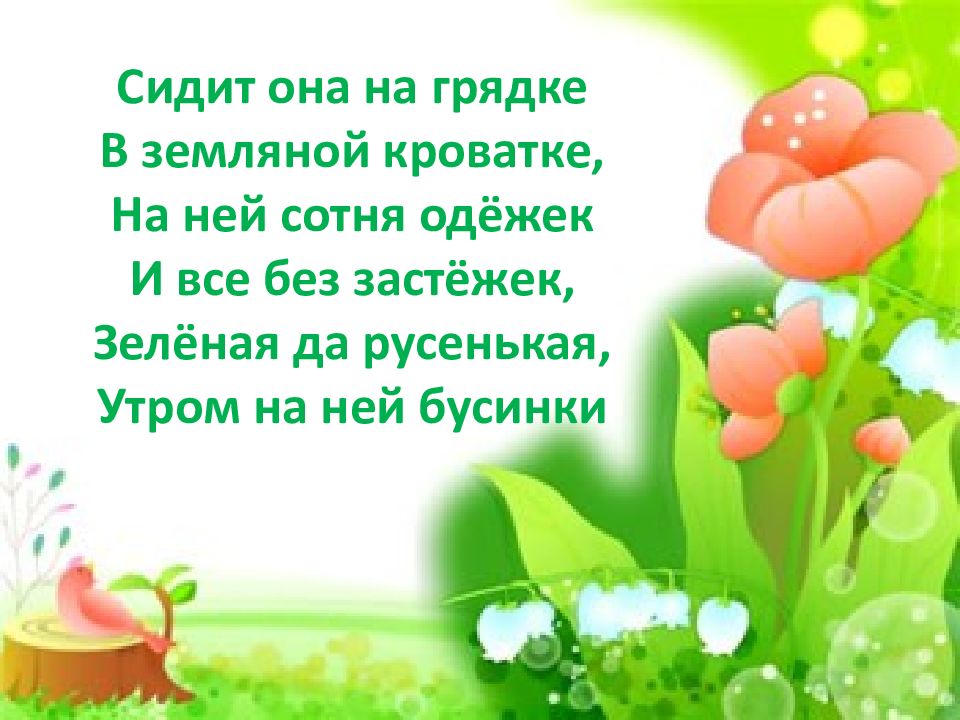 Сидит она на грядке В земляной кроватке, На ней сотня одёжек И все без застёжек, Зелёная да русенькая, Утром на ней бусинки