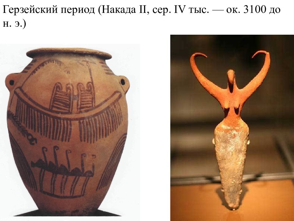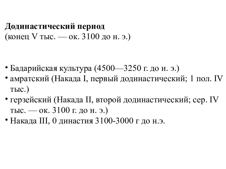 Додинастический период (конец V тыс. — ок. 3100 до н. э.) Бадарийская культура (4500—3250 г. до н. э.) амратский (Накада I, первый додинастический; 1 пол. IV тыс.) герзейский (Накада II, второй додинастический; сер. IV тыс. — ок. 3100 г. до н. э.) Накада III, 0 династия 3100-3000 г до н.э.