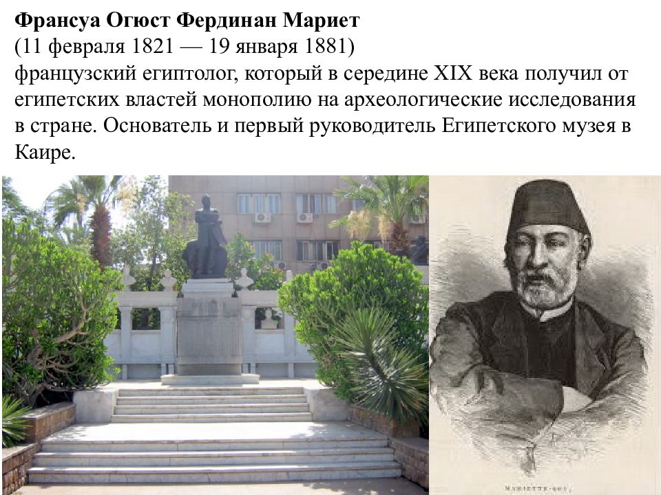 Франсуа Огюст Фердинан Мариет (11 февраля 1821 — 19 января 1881) французский египтолог, который в середине XIX века получил от египетских властей монополию на археологические исследования в стране. Основатель и первый руководитель Египетского музея в Каире.
