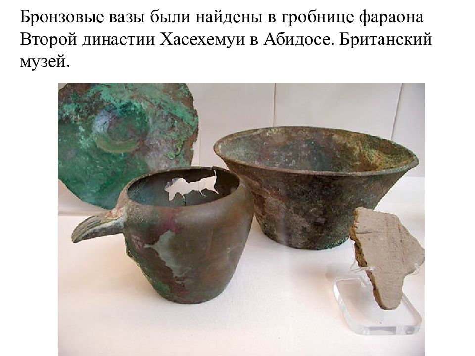 Бронзовые вазы были найдены в гробнице фараона Второй династии Хасехемуи в Абидосе. Британский музей.