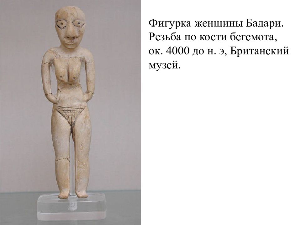 Фигурка женщины Бадари. Резьба по кости бегемота, ок. 4000 до н. э, Британский музей.