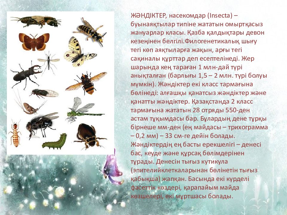 ЖӘНДІКТЕР, насекомдар ( Insecta ) – буынаяқтылар типіне жататын омыртқасыз жануарлар класы. Қазба қалдықтары девон кезеңінен белгілі. Филогенетикалық шығу тегі көп аяқтыларға жақын, арғы тегі сақиналы құрттар деп есептелінеді. Жер шарында кең тараған 1 млн-дай түрі анықталған ( барлығы 1,5 – 2 млн. түрі болуы мүмкін ). Жәндіктер екі класс тармағына бөлінеді : алғашқы қанатсыз жәндіктер және қанатты жәндіктер. Қазақстанда 2 класс тармағына жататын 28 отряды 550-ден астам тұқымдасы бар. Бұлардың дене тұрқы бірнеше мм-ден (ең майдасы – трихограмма – 0,2 мм) – 33 см-ге дейін болады. Жәндіктердің ең басты ерекшелігі – денесі бас, кеуде және құрсақ бөлімдерінен тұрады. Денесін тығыз кутикула ( эпителийклеткаларынан бөлінетін тығыз қабықша ) жапқан. Басында екі күрделі фасеттік көздері, қарапайым майда көзшелері, екі мұртшасы болады.