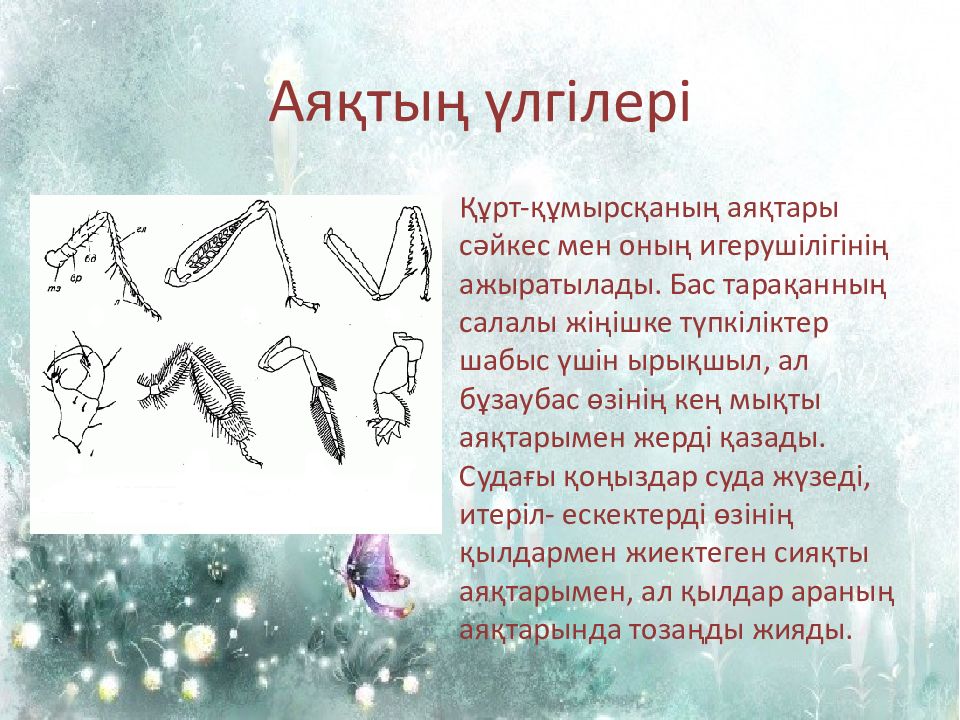 Аяқтың үлгілері Құрт-құмырсқаның аяқтары сәйкес мен оның игерушілігінің ажыратылады. Бас тарақанның салалы жіңішке түпкіліктер шабыс үшін ырықшыл, ал бұзаубас өзінің кең мықты аяқтарымен жерді қазады. Судағы қоңыздар суда жүзеді, итеріл - ескектерді өзінің қылдармен жиектеген сияқты аяқтарымен, ал қылдар араның аяқтарында тозаңды жияды.