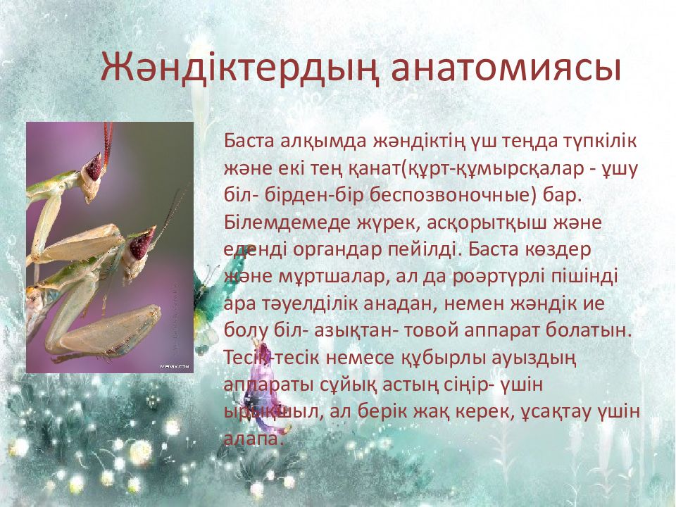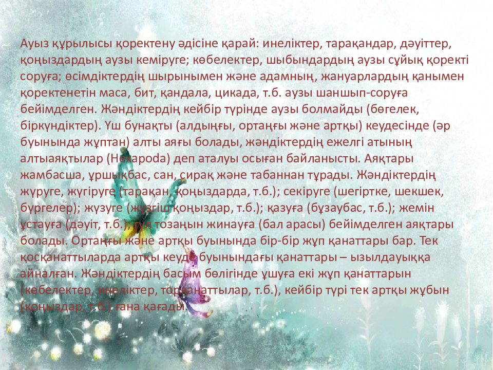 Жәндіктердың анатомиясы Баста алқымда жәндіктің үш теңда түпкілік және екі тең қанат ( құрт-құмырсқалар - ұшу біл - бірден-бір беспозвоночные) бар. Білемдемеде жүрек, асқорытқыш және еденді органдар пейілді. Баста көздер және мұртшалар, ал да роәртүрлі пішінді ара тәуелділік анадан, немен жәндік ие болу біл - азықтан- товой аппарат болатын. Тесік-тесік немесе құбырлы ауыздың аппараты сұйық астың сіңір- үшін ырықшыл, ал берік жақ керек, ұсақтау үшін алапа.