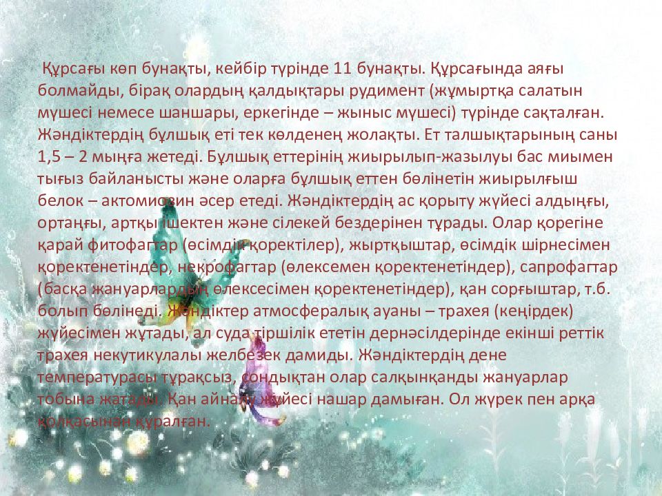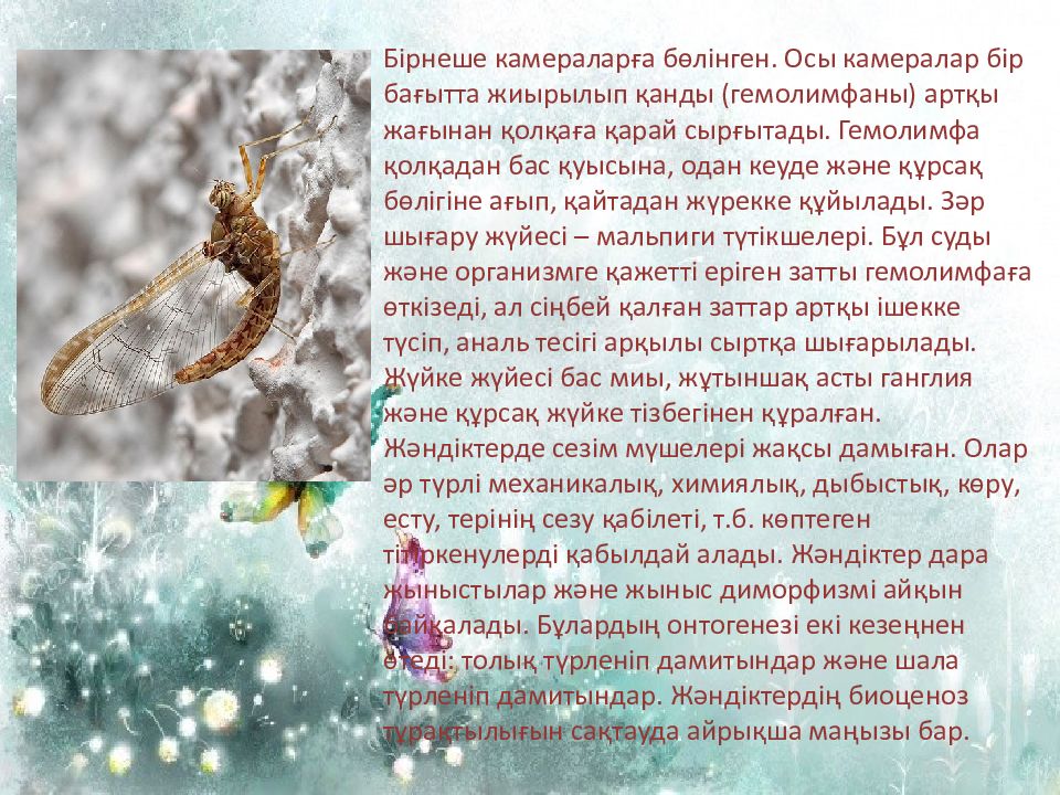 Бірнеше камераларға бөлінген. Осы камералар бір бағытта жиырылып қанды ( гемолимфаны ) артқы жағынан қолқаға қарай сырғытады. Гемолимфа қолқадан бас қуысына, одан кеуде және құрсақ бөлігіне ағып, қайтадан жүрекке құйылады. Зәр шығару жүйесі – мальпиги түтікшелері. Бұл суды және организмге қажетті еріген затты гемолимфаға өткізеді, ал сіңбей қалған заттар артқы ішекке түсіп, аналь тесігі арқылы сыртқа шығарылады. Жүйке жүйесі бас миы, жұтыншақ асты ганглия және құрсақ жүйке тізбегінен құралған. Жәндіктерде сезім мүшелері жақсы дамыған. Олар әр түрлі механикалық, химиялық, дыбыстық, көру, есту, терінің сезу қабілеті, т.б. көптеген тітіркенулерді қабылдай алады. Жәндіктер дара жыныстылар және жыныс диморфизмі айқын байқалады. Бұлардың онтогенезі екі кезеңнен өтеді: толық түрленіп дамитындар және шала түрленіп дамитындар. Жәндіктердің биоценоз тұрақтылығын сақтауда айрықша маңызы бар.