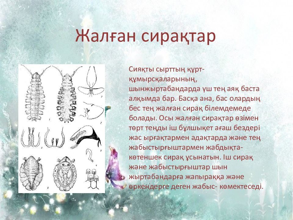 Жалған сирақтар Сияқты сырттың құрт-құмырсқаларының, шынжыртабандарда үш тең аяқ баста алқымда бар. Басқа ана, бас олардың бес тең жалған сирақ білемдемеде болады. Осы жалған сирақтар өзімен төрт теңды іш бұлшықет ағаш бездер i жас ырғақтармен адақтарда және тең жабыстырғыштармен жабдықта- көтеншек сирақ ұсынатын. Іш сирақ және жабыстырғыштар шын жыртабандарға жапыраққа және өркендерге деген жабыс - көмектеседі.