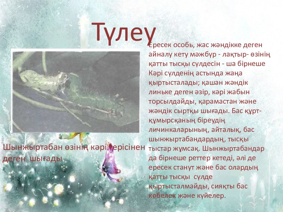 Түлеу Шынжыртабан өзінің кәрі терісінен деген шығады Ересек особь, жас жәндікке деген айналу кету мәжбүр - лақтыр- өзінің қатты тысқы сүлдесін - ша б i рнеше Кәрі сүлденің астында жаңа қыртысталады; қашан жәндік линьке деген әзір, кәрі жабын торсылдайды, қарамастан және жәндік сыртқы шығады. Бас құрт-құмырсқаның біреудің личинкаларының, айталық, бас шынжыртабандардың, тысқы тыстар жұмсақ. Шынжыртабандар да б i рнеше реттер кетеді, әлі де ересек станут және бас олардың қатты тысқы сүлде қыртысталмайды, сияқты бас көбелек және күйелер.
