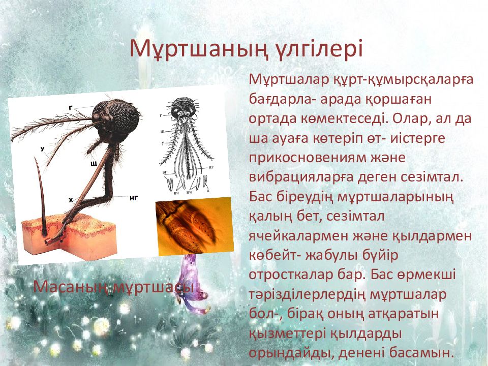 Мұртшаның үлгілері Мұртшалар құрт-құмырсқаларға бағдарла- арада қоршаған ортада көмектеседі. Олар, ал да ша ауаға көтеріп өт- иістерге прикосновениям және вибрацияларға деген сезімтал. Бас біреудің мұртшаларының қалың бет, сезімтал ячейкалармен және қылдармен көбейт- жабулы бүйір отросткалар бар. Бас өрмекші тәрізділерлердің мұртшалар бол-, бірақ оның атқаратын қызметтері қылдарды орындайды, денені басамын. М асаның мұртшасы