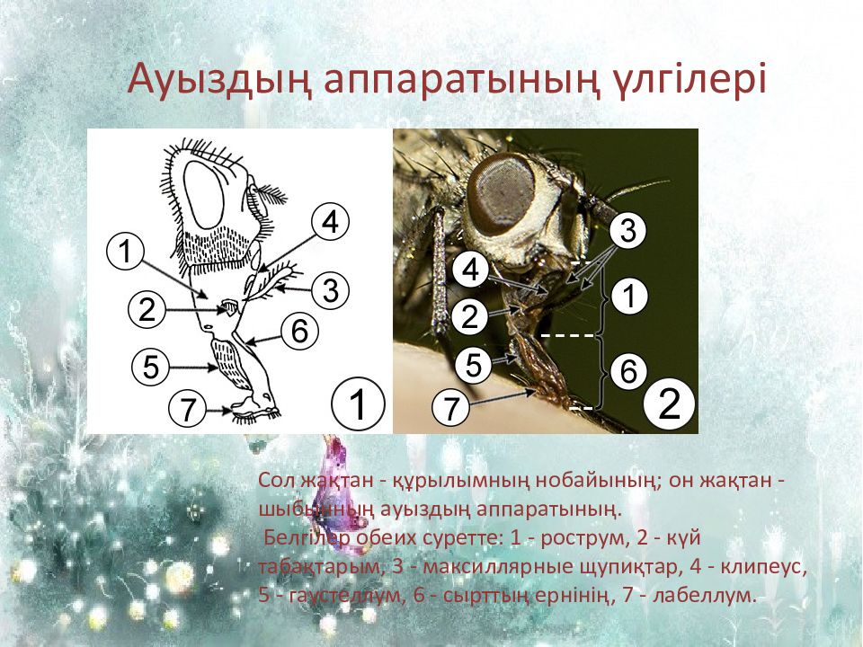 Ауыздың аппаратының үлгілері Сол жақтан - құрылымның нобайының; он жақтан - шыбынның ауыздың аппаратының. Белгілер обеих суретте : 1 - рострум, 2 - күй табақтарым, 3 - максиллярные щупиқтар, 4 - клипеус, 5 - гаустеллум, 6 - сырттың ернінің, 7 - лабеллум.