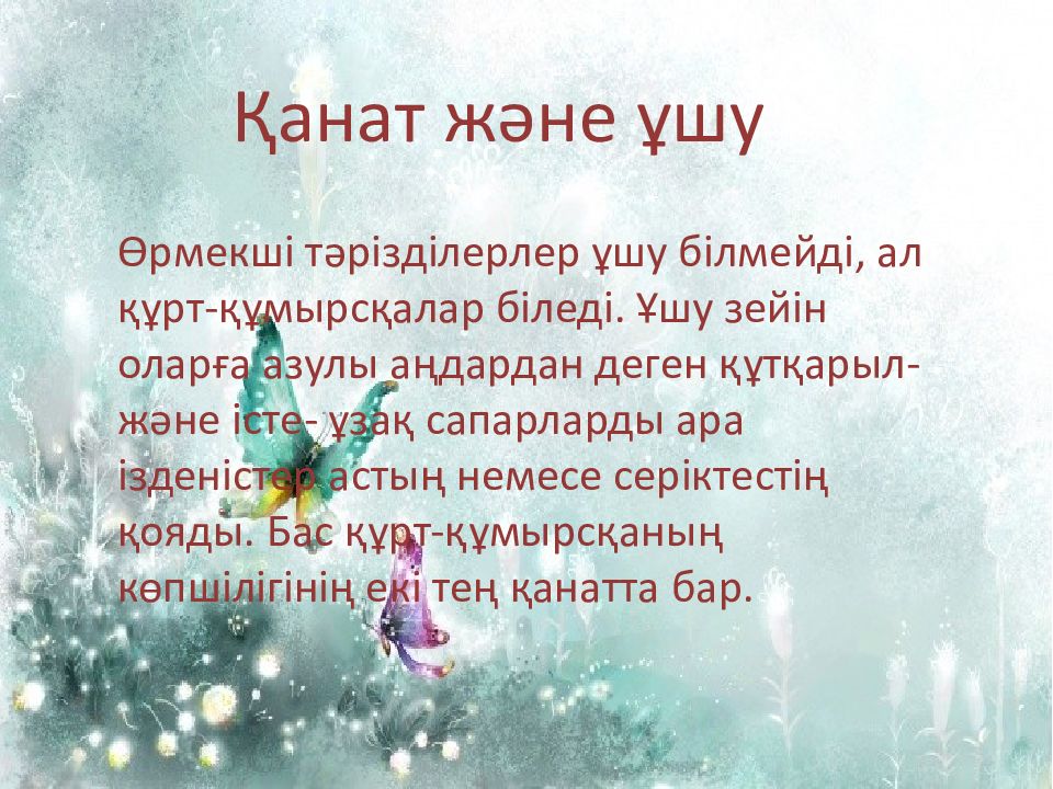 Қанат және ұшу Өрмекші тәрізділерлер ұшу білмейді, ал құрт-құмырсқалар біледі. Ұшу зейін оларға азулы аңдардан деген құтқарыл- және істе - ұзақ сапарларды ара ізденістер астың немесе серіктестің қояды. Бас құрт-құмырсқаның көпшілігінің екі тең қанатта бар.