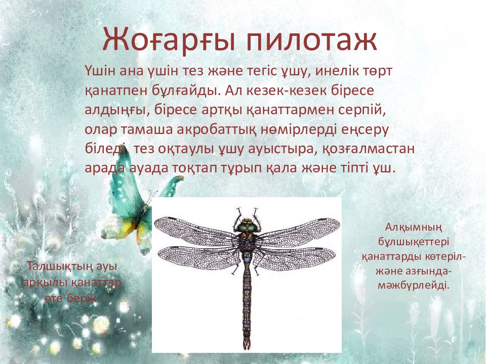 Жоғарғы пилотаж Үшін ана үшін тез және тегіс ұшу, инелік төрт қанатпен бұлғайды. Ал кезек-кезек біресе алдыңғы, біресе артқы қанаттармен серпій, олар тамаша акробаттық нөмірлерді еңсеру біледі, тез оқтаулы ұшу ауыстыра, қозғалмастан арада ауада тоқтап тұрып қала және тіпті ұш. Талшықтың ауы арқылы қанаттар өте берік. Алқымның бұлшықеттері қанаттарды көтеріл- және азғында- мәжбүрлейді.