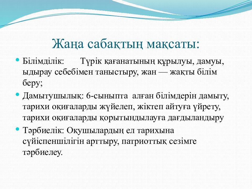 Білімділік : Түрік қағанатының құрылуы, дамуы, ыдырау себебімен таныстыру, жан — жақты білім беру; Дамытушылық: 6-сыныпта алған білімдерін дамыту, тарихи оқиғаларды жүйелеп, жіктеп айтуға үйрету, тарихи оқиғаларды қорытындылауға дағдыландыру Тәрбиелік: Оқушылардың ел тарихына сүйіспеншілігін арттыру, патриоттық сезімге тәрбиелеу.