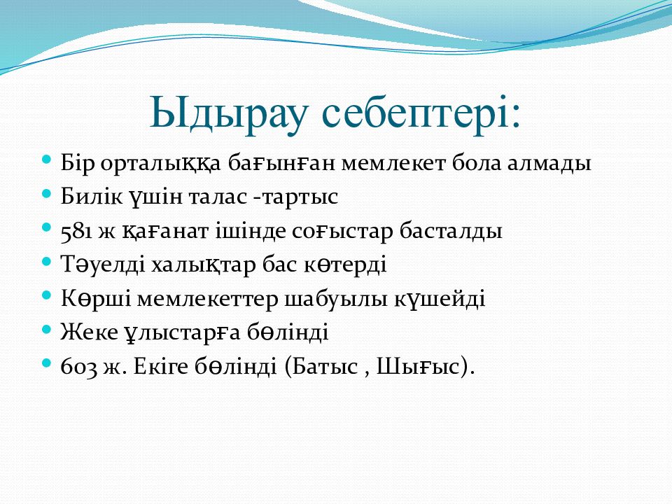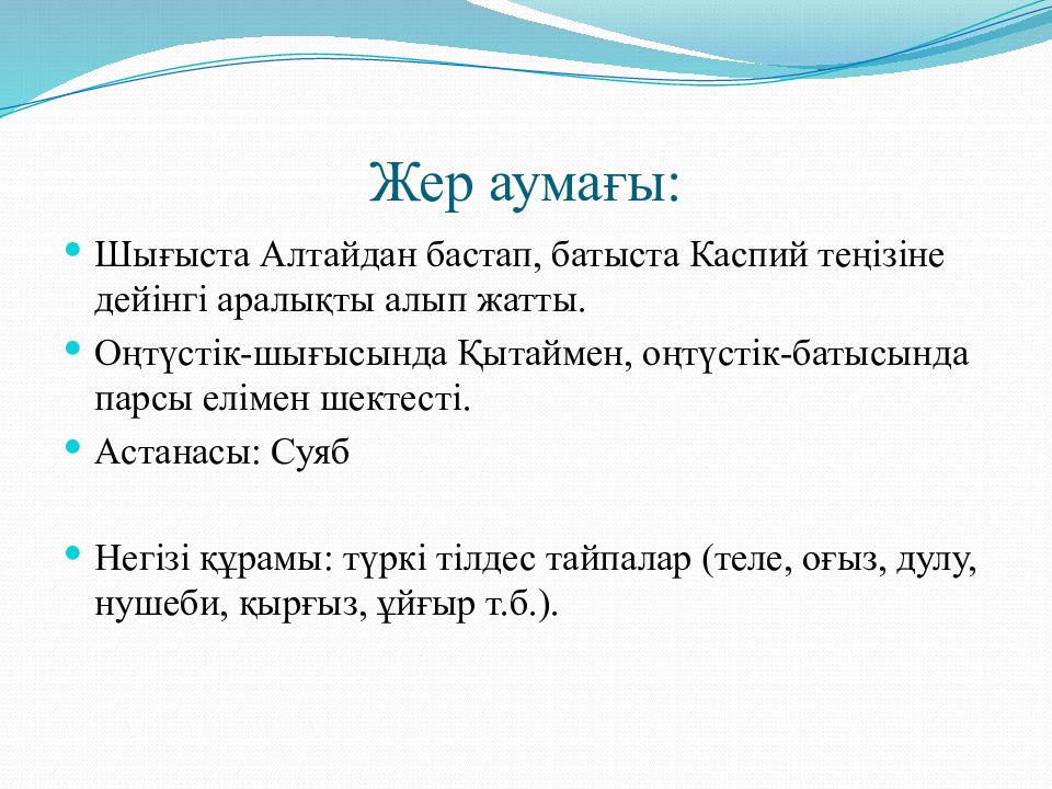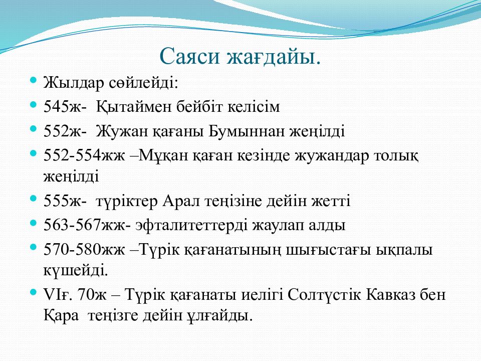 1.Түрік қағанатының құрылуы 2. Жер аумағы 3. Саяси жағдайы 4. Ыдырауы