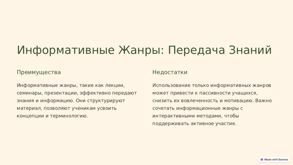 Информативные Жанры: Передача Знаний Преимущества Информативные жанры, такие как лекции, семинары, презентации, эффективно передают знания и информацию. Они структурируют материал, позволяют ученикам усвоить концепции и терминологию. Недостатки Использование только информативных жанров может привести к пассивности учащихся, снизить их вовлеченность и мотивацию. Важно сочетать информационные жанры с интерактивными методами, чтобы поддерживать активное участие.