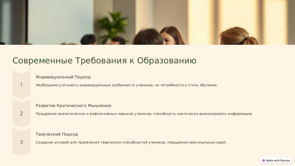 Современные Требования к Образованию Индивидуальный Подход Необходимо учитывать индивидуальные особенности учеников, их потребности и стиль обучения. Развитие Критического Мышления Поощрение аналитических и рефлексивных навыков учеников, способность критически анализировать информацию. Творческий Подход Создание условий для проявления творческих способностей учеников, поощрение оригинальных идей.