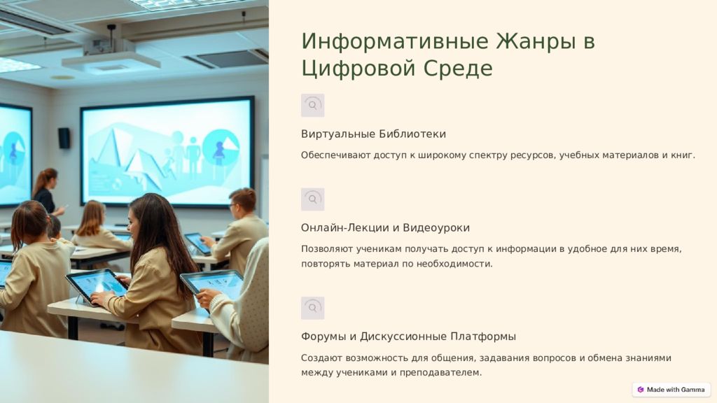 Информативные Жанры в Цифровой Среде Виртуальные Библиотеки Обеспечивают доступ к ширoкому спектру ресурсов, учебных материалов и книг. Онлайн-Лекции и Видеоуроки Позволяют ученикам получать доступ к информации в удобное для них время, повторять материал по необходимости. Форумы и Дискуссионные Платформы Создают возможность для общения, задавания вопросов и обмена знаниями между учениками и преподавателем.