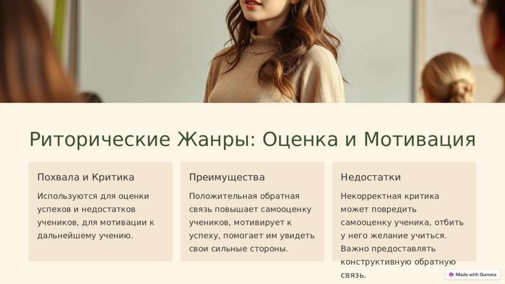 Риторические Жанры: Оценка и Мотивация Похвала и Критика Используются для оценки успехов и недостатков учеников, для мотивации к дальнейшему учению. Преимущества Положительная обратная связь повышает самооценку учеников, мотивирует к успеху, помогает им увидеть свои сильные стороны. Недостатки Некорректная критика может повредить самооценку ученика, отбить у него желание учиться. Важно предоставлять конструктивную обратную связь.