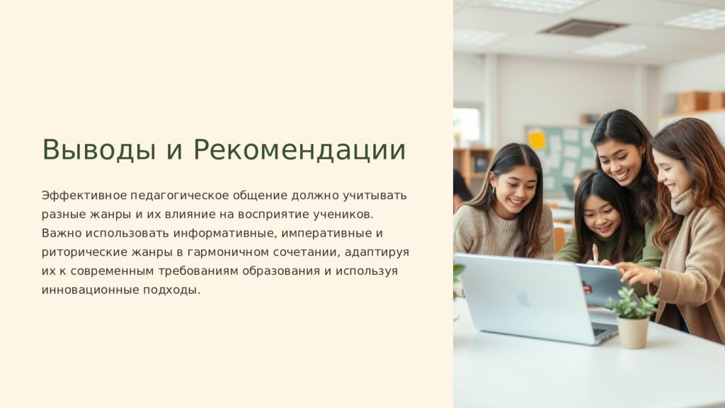 Выводы и Рекомендации Эффективное педагогическое общение должно учитывать разные жанры и их влияние на восприятие учеников. Важно использовать информативные, императивные и риторические жанры в гармоничном сочетании, адаптируя их к современным требованиям образования и используя инновационные подходы.