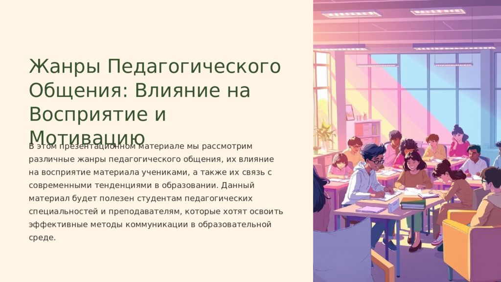 Жанры Педагогического Общения: Влияние на Восприятие и Мотивацию В этом презентационном материале мы рассмотрим различные жанры педагогического общения, их влияние на восприятие материала учениками, а также их связь с современными тенденциями в образовании. Данный материал будет полезен студентам педагогических специальностей и преподавателям, которые хотят освоить эффективные методы коммуникации в образовательной среде.
