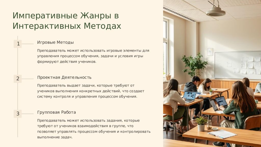 Императивные Жанры в Интерактивных Методах 1 Игровые Методы Преподаватель может использовать игровые элементы для управления процессом обучения, задачи и условия игры формируют действия учеников. 2 Проектная Деятельность Преподаватель выдает задачи, которые требуют от учеников выполнения конкретных действий, что создает систему контроля и управления процессом обучения. 3 Групповая Работа Преподаватель может использовать задания, которые требуют от учеников взаимодействия в группе, что позволяет управлять процессом обучения и контролировать выполнение задач.