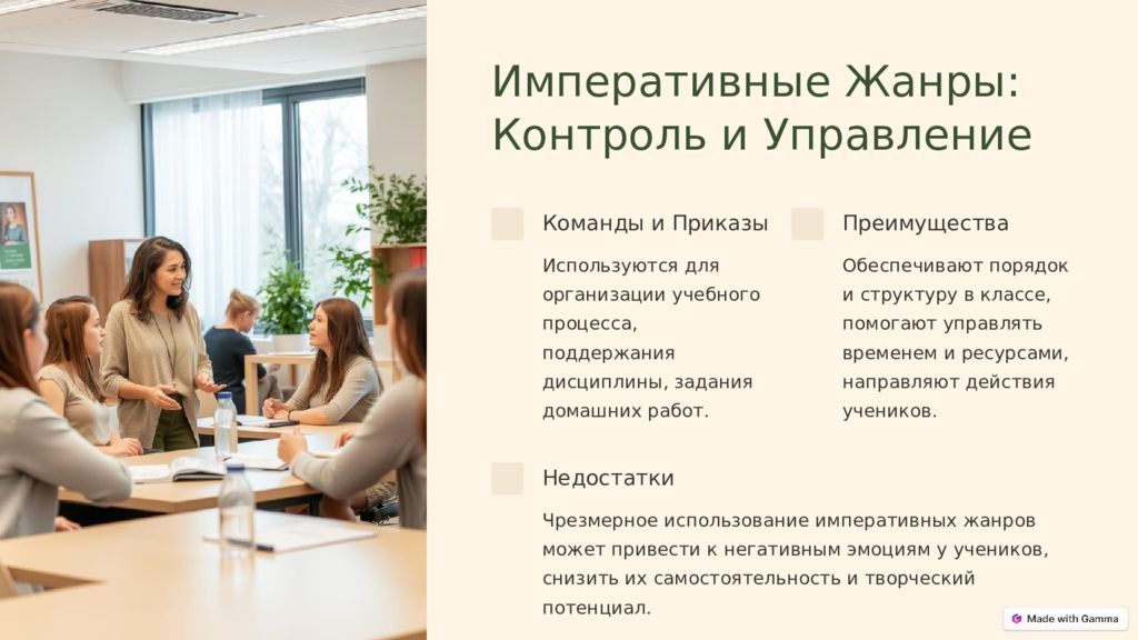 Императивные Жанры: Контроль и Управление Команды и Приказы Используются для организации учебного процесса, поддержания дисциплины, задания домашних работ. Преимущества Обеспечивают порядок и структуру в классе, помогают управлять временем и ресурсами, направляют действия учеников. Недостатки Чрезмерное использование императивных жанров может привести к негативным эмоциям у учеников, снизить их самостоятельность и творческий потенциал.