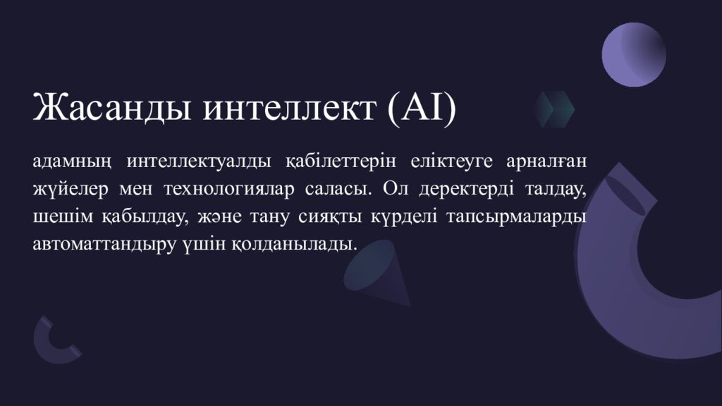 адамның интеллектуалды қабілеттерін еліктеуге арналған жүйелер мен технологиялар саласы. Ол деректерді талдау, шешім қабылдау, және тану сияқты күрделі тапсырмаларды автоматтандыру үшін қолданылады.