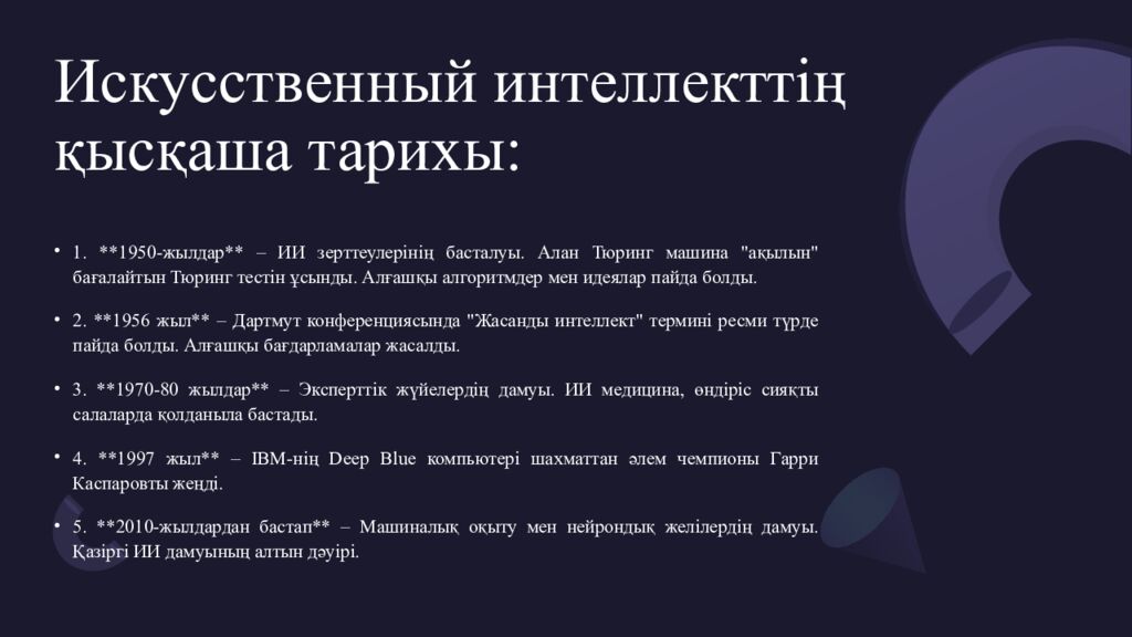 1. **1950-жылдар** – ИИ зерттеулерінің басталуы. Алан Тюринг машина " ақылын " бағалайтын Тюринг тестін ұсынды. Алғашқы алгоритмдер мен идеялар пайда болды. 2. **1956 жыл ** – Дартмут конференциясында " Жасанды интеллект" термині ресми түрде пайда болды. Алғашқы бағдарламалар жасалды. 3. **1970-80 жылдар ** – Эксперттік жүйелердің дамуы. ИИ медицина, өндіріс сияқты салаларда қолданыла бастады. 4. **1997 жыл ** – IBM- нің Deep Blue компьютері шахматтан әлем чемпионы Гарри Каспаровты жеңді. 5. **2010-жылдардан бастап ** – Машиналық оқыту мен нейрондық желілердің дамуы. Қазіргі ИИ дамуының алтын дәуірі.